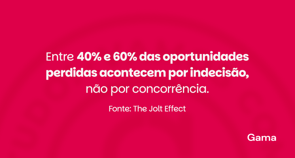 Aliás, essa quantidade de partes envolvidas pode ser um dos motivos para outro problema recorrente: a indecisão. Como aponta o livro The Jolt Effect, que mencionamos no último artigo do nosso blog, entre 40% e 60% das oportunidades perdidas acontecem por indecisão, não por concorrência.
