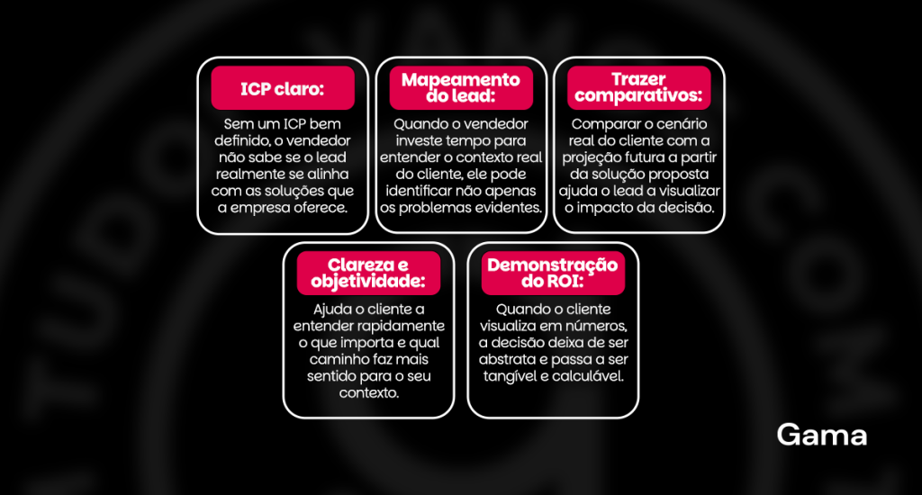 O vendedor se torna um consultor confiável, guiando a decisão com base em um entendimento profundo, não em suposições ou soluções superficiais.